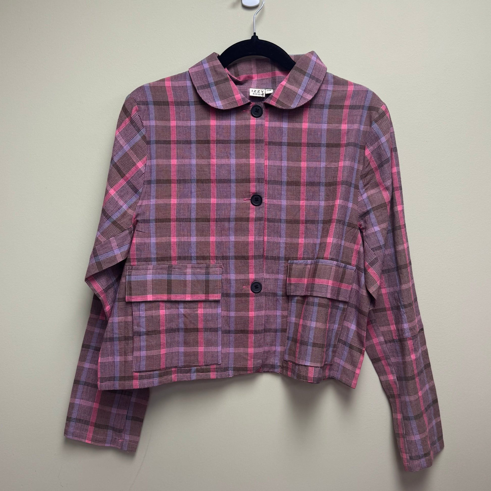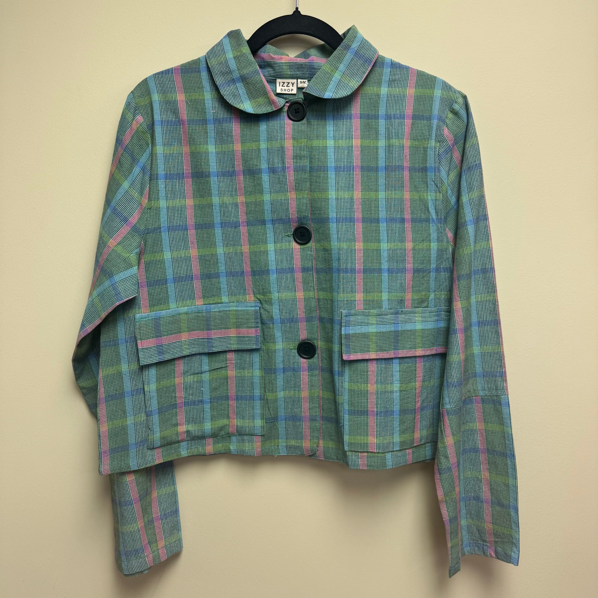This lightweight shirt jacket is made from handloom-woven check fabric from West Bengal. It is designed with a foldover collar, button-down front, full-length sleeves, and flap pockets.